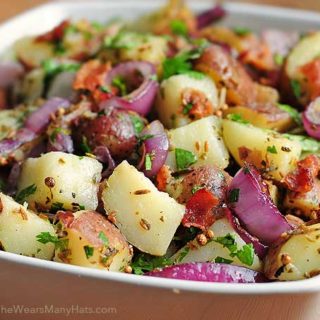 Serve this Texas Style New Potato Salad Recipe tossed with crispy bacon and grilled onions and just watch it disappear before the burgers and hot dogs do.